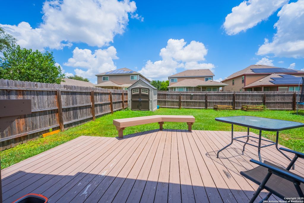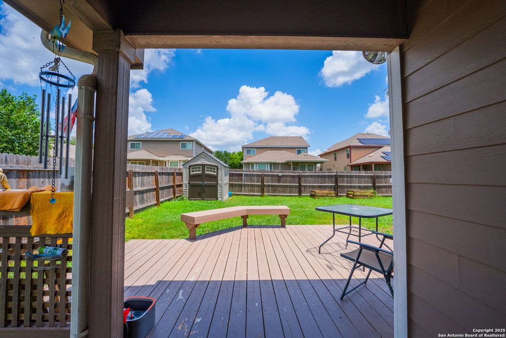 Outside, enjoy a covered patio shaded by a deck extension and built‑in wooden bench. This outdoor oasis blends function with relaxation.
