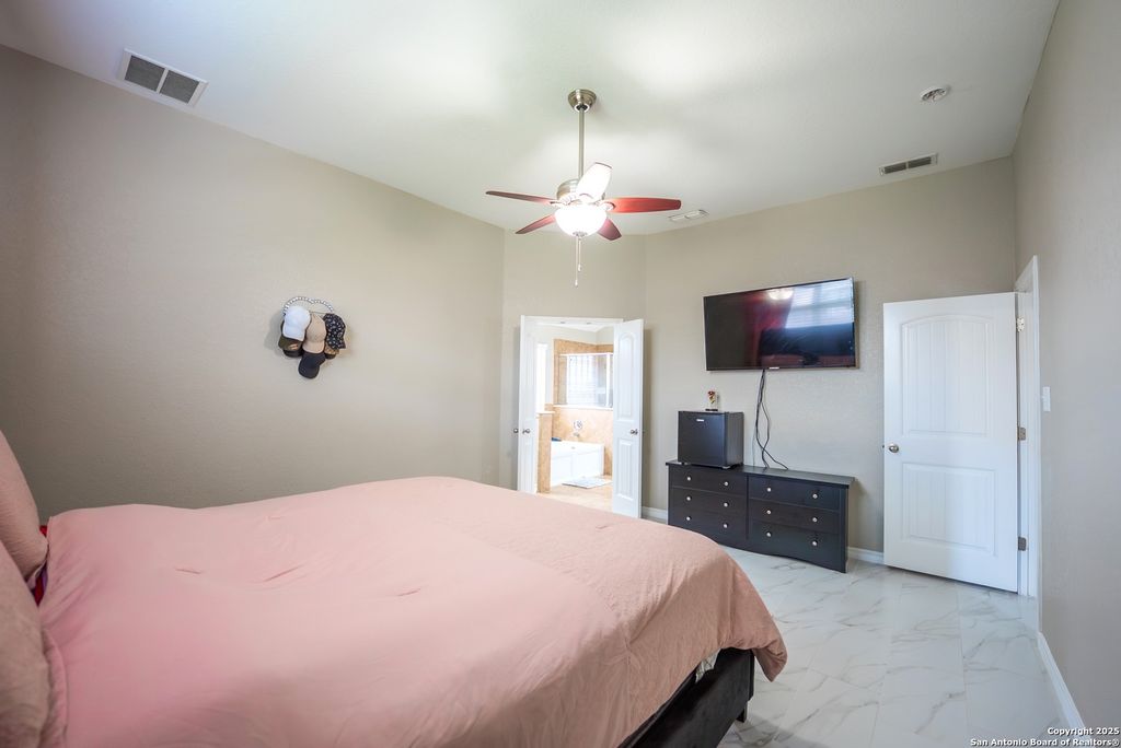 Follow the corridor to the luxurious primary suite. Flooded with natural light, this room sits beneath the same elegant tile flooring and continues the bright, airy palette of the home.