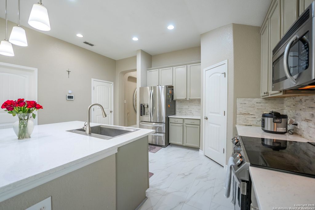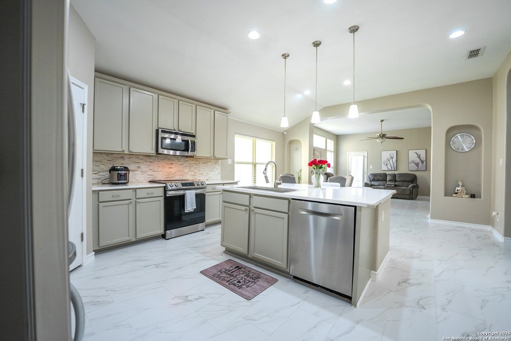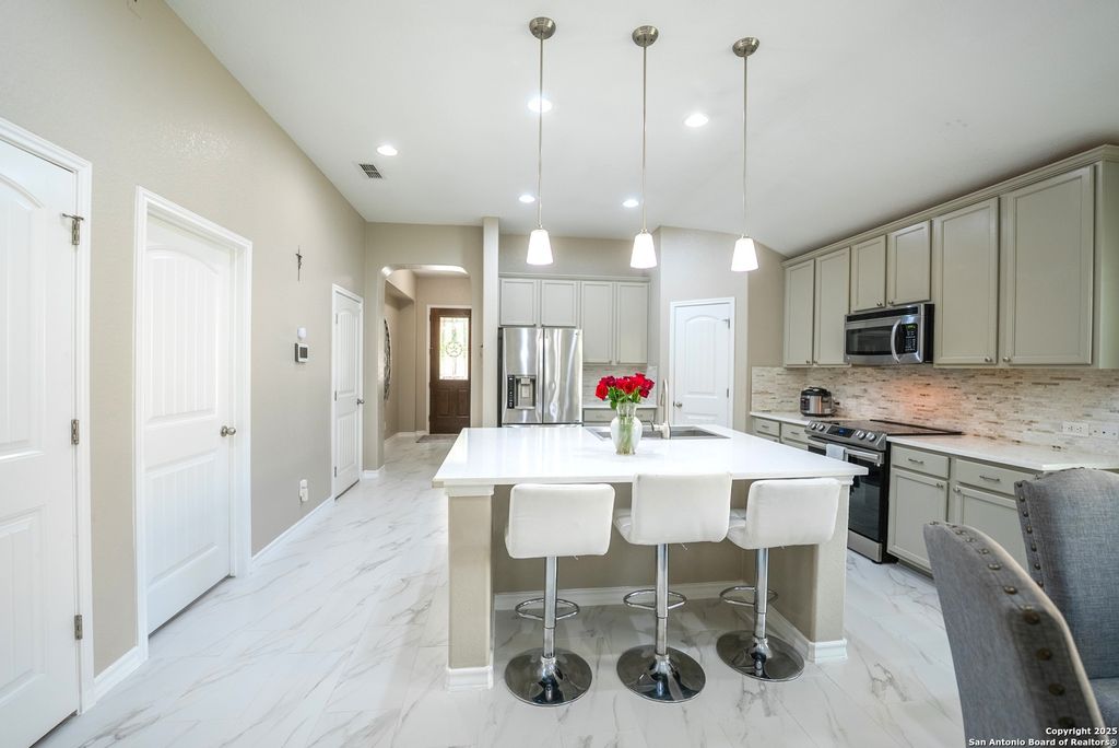 Discover the gourmet kitchen—stunning quartz countertops, a mosaic sleek white backsplash, stainless steel appliances, and ample cabinetry. Three pendant lights hover above a central island, perfectly balancing form and function. This area flows seamlessly into the connected dining and living zones, making it ideal for entertaining and everyday living.