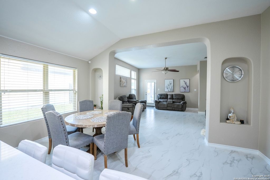Natural light floods the space, bouncing off white marbled tile flooring that extends throughout the main living areas and the primary suite.