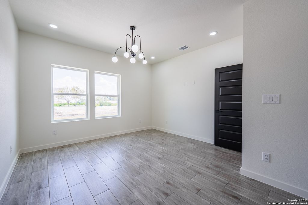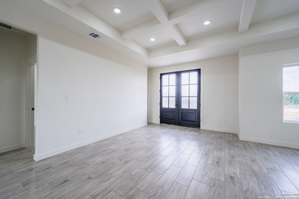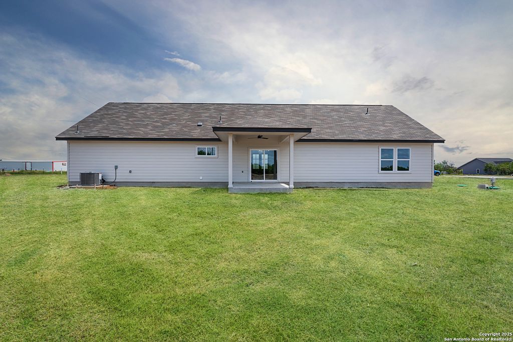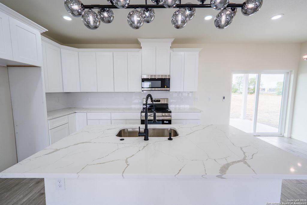 *** Offering 5k towards closing cost *** Nestled in the quiet charm of Natalia, Texas, discover 122 Ranchero Way - a stunning brand-new contemporary residence set upon a sweeping one-acre canvas. With its sophisticated stucco facade, striking stone entrance, and bold black trim, this home commands attention before you even step inside. Thoughtful landscaping frames the front, while a distinguished stone address plaque and elegant French doors with obscured glass set the tone for the refined spaces that await within. Inside, you're immediately greeted by an 11-foot coffered ceiling that spans the living area, accented with recessed lighting and large windows that flood the space with natural light. The open layout seamlessly connects the living, dining, and kitchen areas, creating a flow that feels both modern and inviting. The kitchen is a showstopper with its all-white cabinetry, glossy subway tile backsplash, and white marbled quartz countertops. A center island with barstool seating provides the perfect gathering spot, while a metallic glass globe chandelier mirrors the elegance of the dining light fixture. Stainless steel appliances and a walk-in pantry with built-in shelving complete the space. The primary suite is privately tucked away from the other bedrooms, featuring a stylish frosted-globe chandelier, six-panel closet doors, and plenty of room to unwind. The en suite bath is designed with spa-like detail - a soaking tub, single vanity with quartz countertop, pendant lighting, and a full-height marble tile backsplash with a built-in niche. The additional bedrooms each feature industrial pendant lights, natural light, and spacious closets with six-panel double doors. They share a full bathroom with a double vanity, quartz counters, a sleek modern black light fixture, and a shower-tub combo with marble tile to the ceiling. Throughout the home, luxury vinyl plank flooring in a gray wood-grain finish ties everything together with both durability and style. Step outside, and you'll find a covered patio with a remote controlled ceiling fan overlooking the full acre of open land - a blank canvas ready to be personalized. And then, there's the garage - a massive oversized 22 by 31-foot space, extra deep and ready to accommodate vehicles, storage, or even a workshop. This is a home that blends modern design with comfort, functionality, and room to grow - a truly remarkable new build here in Natalia.