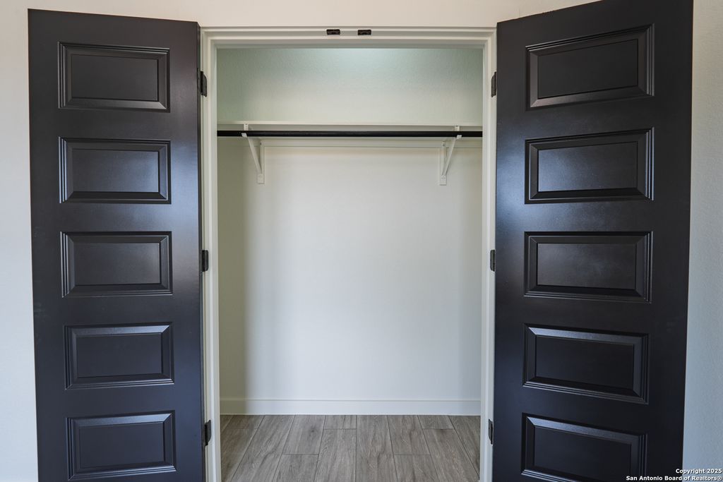 The additional bedrooms each feature industrial pendant lights, natural light, and spacious closets with six-panel double doors. They share a full bathroom with a double vanity, quartz counters, a sleek modern black light fixture, and a shower-tub combo with marble tile to the ceiling.