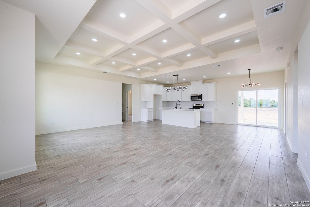 Inside, you’re immediately greeted by an 11-foot coffered ceiling that spans the living area, accented with recessed lighting and large windows that flood the space with natural light. The open layout seamlessly connects the living, dining, and kitchen areas, creating a flow that feels both modern and inviting.