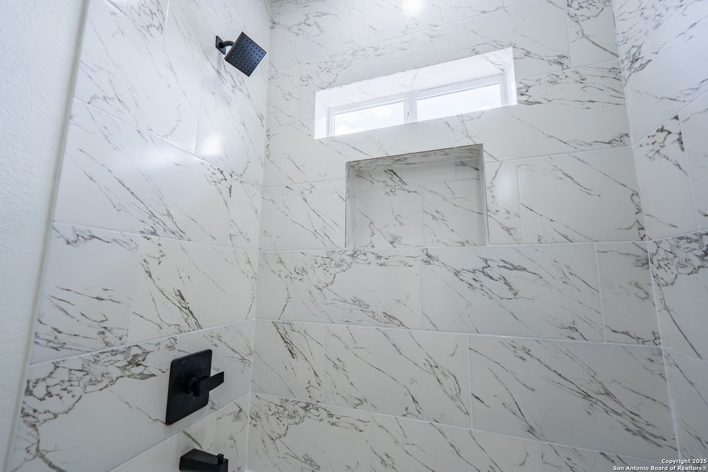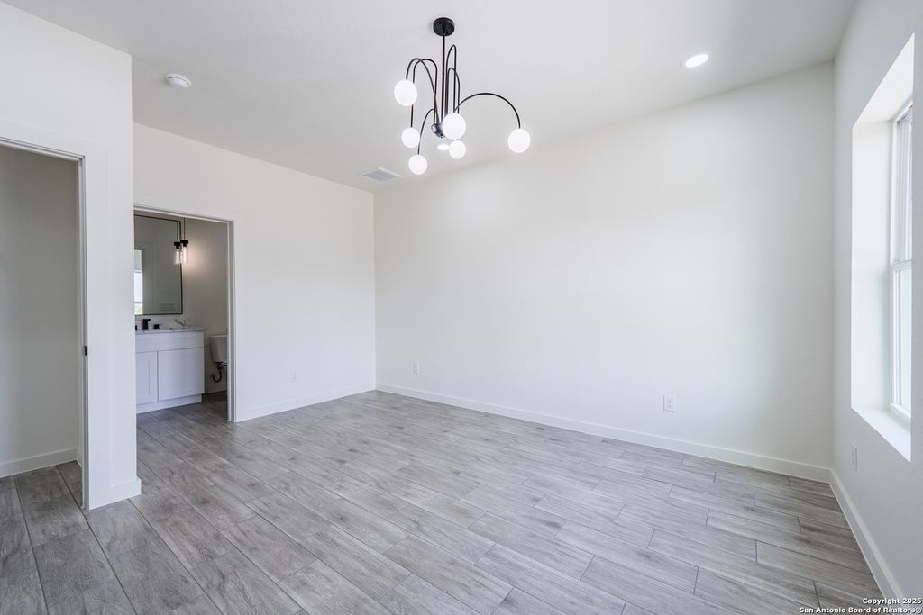 The primary suite is privately tucked away from the other bedrooms, featuring a stylish frosted-globe chandelier, six-panel closet doors, and plenty of room to unwind. The en suite bath is designed with spa-like detail — a soaking tub, single vanity with quartz countertop, pendant lighting, and a full-height marble tile backsplash with a built-in niche.