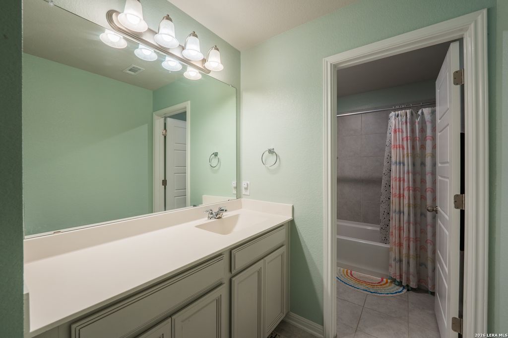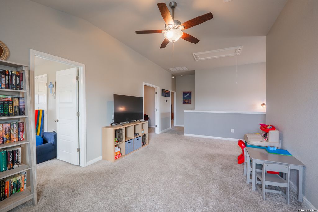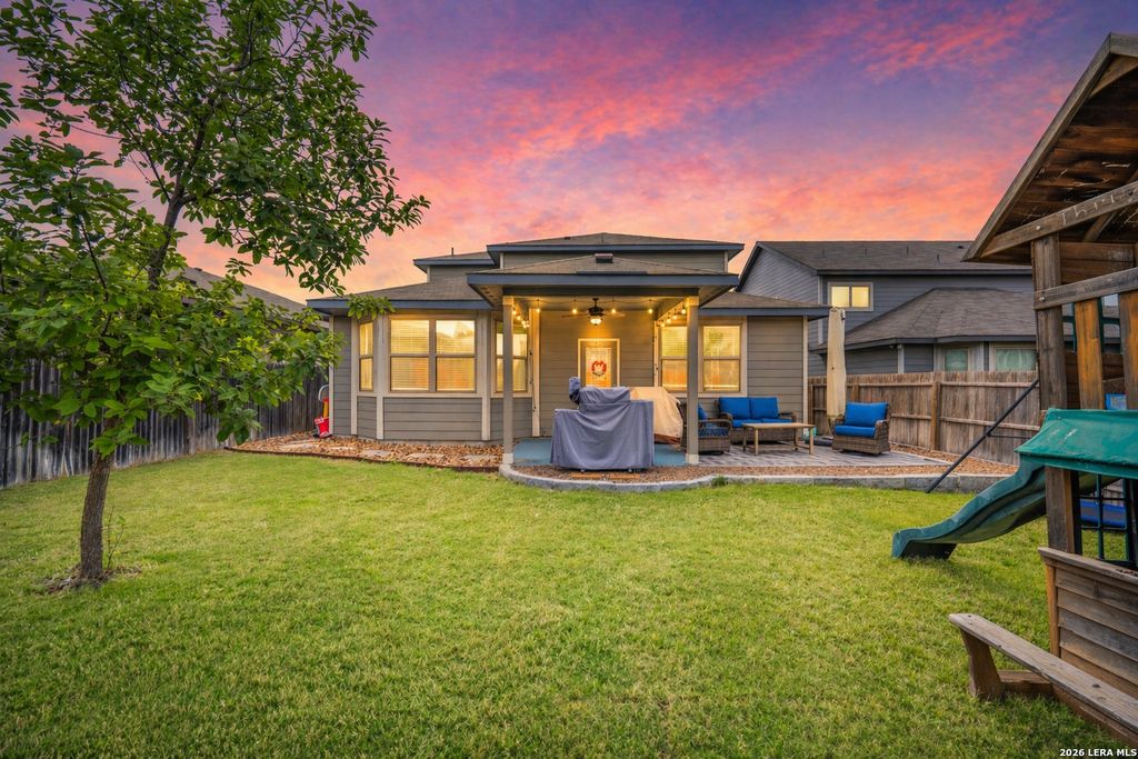 Welcome home to 13207 Antelope Run. Located in the Asher Place community, you are near Randolph AFB, Ft Sam Houston, SAMMC, and 20min from downtown San Antonio. This 5 bedroom 4 bath is almost 2,800 sq ft. Upon arrival, you are greeted with a beautiful stone exterior, covered porch with pillars, and designer front door. From the entryway, you'll immediately notice the stylish luxury vinyl plank flooring and to the left, the first bedroom that could also be an office. Further down the hall a utility room and office nook. Downstairs full bath with marble counter tops tiled shower/tub combo. You then find yourself immersed into the stunning kitchen kitchen boasting granite countertops, bountiful cabinet space, kitchen island with breakfast bar, subway tile backsplash, Moen faucet with pull down sprayer, stainless steel energy star appliances, reverse osmosis system, recessed lighting, and large pantry. The kitchen is open to the dining and living area with an abundance of natural light and ceiling fan. The well appointed Primary bedroom has raised ceilings, ceiling fan, and bay window. Primary bath has dual sinks in the vanity with marble tops, garden tub with tile backsplash, separate stand up tiled shower, private commode, and HUGE wrap around walk in closet. Upstairs has carpet throughout, high ceilings, loft space perfect for additional living, and a media room prewired for 5.1 surround. The secondary bedrooms are the perfect size with the secondary bath features dual sinks in the vanity with marble top, shower tub combo with tile backsplash. MIL room boasts additional en-suite full bath. This home features a great backyard including covered patio with fan, gas line to set up your outdoor kitchen for fire pit , full yard sprinkler system with rain/freeze sensors, extended patio slab, landscaping, and privacy fence. Built by Meritage homes in 2021, known for their energy efficient homes, you have spray foam insulation in exterior walls and roof, programmable thermostat, double pane low E windows, mechanical fresh air, drought tolerant plants, and more. Added highlights of this amazing home include 4 sided masonry exterior, whole home water softener system, additional overhead garage storage, epoxy garage floors, video doorbell, Multiple water heaters, and NO CITY TAXES with a rate currently under 2%. The neighborhood has a private park sitting on a hill that is one of the highest points in the area giving it a spectacular view for fireworks on New Years and the 4th of July. There is also covered picnic area with restrooms, jogging trail, playground, and a resort style pool. Feeds to award winning Schertz Cibolo Universal City ISD schools with a number of charter schools nearby.