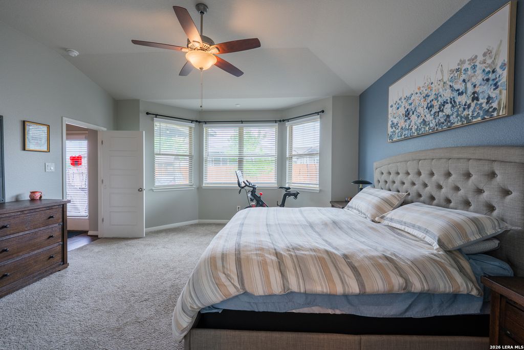 The well appointed Primary bedroom has raised ceilings, ceiling fan, and bay window. Primary bath has dual sinks in the vanity with marble tops, garden tub with tile backsplash, separate stand up tiled shower, private commode, and HUGE wrap around walk in closet. Upstairs has carpet throughout, high ceilings, loft space perfect for additional living, and a media room prewired for 5.1 surround. The secondary bedrooms are the perfect size with the secondary bath features dual sinks in the vanity with marble top, shower tub combo with tile backsplash. MIL room boasts additional en-suite full bath.
