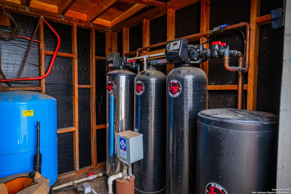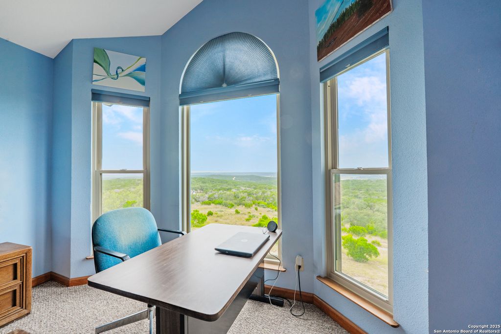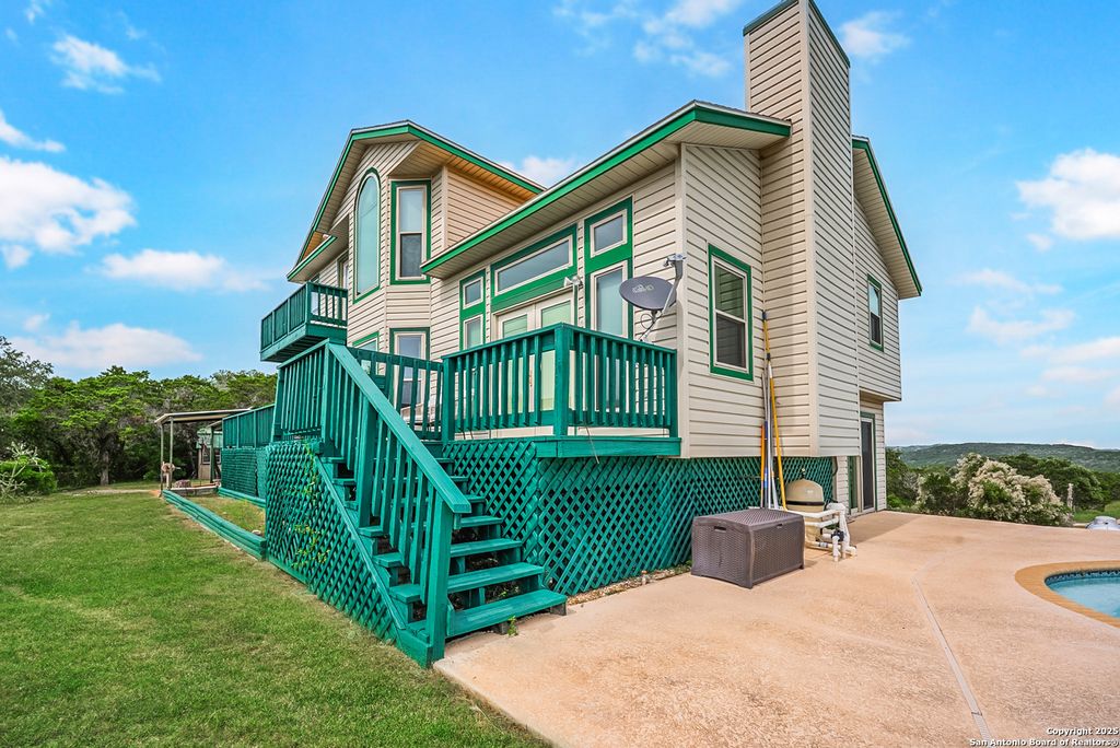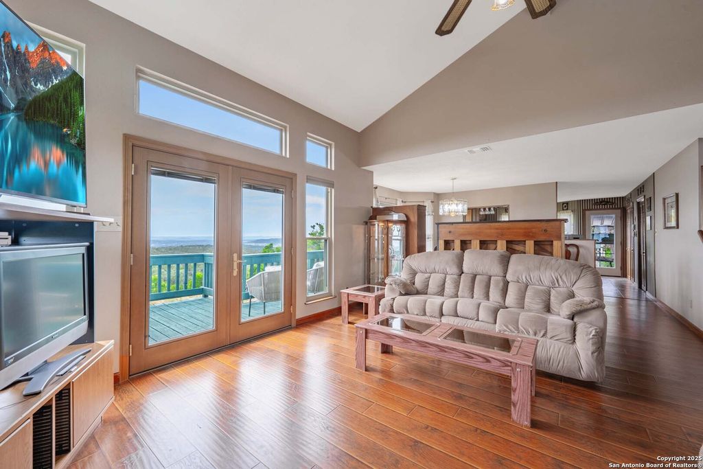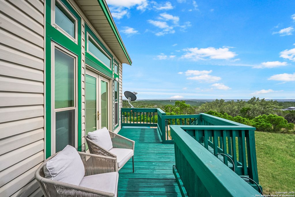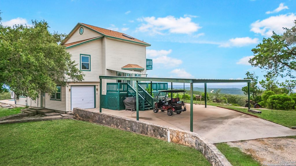 Welcome to 1494 County Road 270, a rare 46.09-acre hilltop estate in Mico, TX, offering panoramic views of Medina Lake and the surrounding Hill Country. This Tudor-style 3 bed, 2 bath home sits atop one of the highest elevations in the area, with unmatched privacy, breathtaking scenery, and zero HOA or deed restrictions. Inside, you’ll find an open floor plan with vaulted ceilings in the living room, a gas fireplace, and beautifully updated flooring throughout. The kitchen features an upgraded gas range, along with extensive storage and light-filled bay windows in the breakfast nook. Additional bay windows in the formal dining room and upstairs primary suite take full advantage of the views. The split-level layout offers two guest bedrooms and a full bathroom with skylight, while the upstairs primary suite includes its own remodeled en suite bath, a walk-in closet, and private step-out balcony – the perfect perch to watch the sun rise over the lake. On the main level, a half-wraparound deck faces the lake, ideal for sipping morning coffee or relaxing in solitude. Below the home, a separate guest suite with full bath and private entrance offers excellent STR or creative space potential (not included in the main home’s square footage or bed/bath count). Recent upgrades include: a motorized gated entrance, chip-sealed driveway, new roofs on the home and pump house, updated HVAC system and water heater, upgraded breaker panel, improved insulation, remodeled primary bathroom, and all new Window World brand windows and exterior doors. The estate includes three sheds: a traditional storage shed, a repurposed chapel now serving as a charming workshop, and a fully equipped pump house with a private well, water purification system, and softener. A greenhouse and two livestock shelters add further functionality to the land. Just 17 miles down Culebra from Loop 1604, this property offers unmatched versatility, seclusion, and long-term potential. Schedule your private showing today. For more information, contact one of our REALTORS® today!