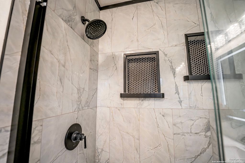 Recently updated, the bathroom is a true retreat with marbled tile, a walk-in shower featuring a floor-to-ceiling backsplash, built-in niches, and elegant black fixtures with a crystal and chrome vanity light. The single vanity is paired with a frameless lighted anti fog mirror.