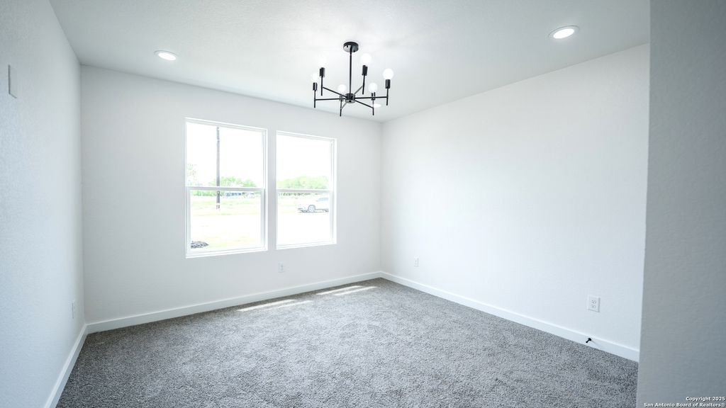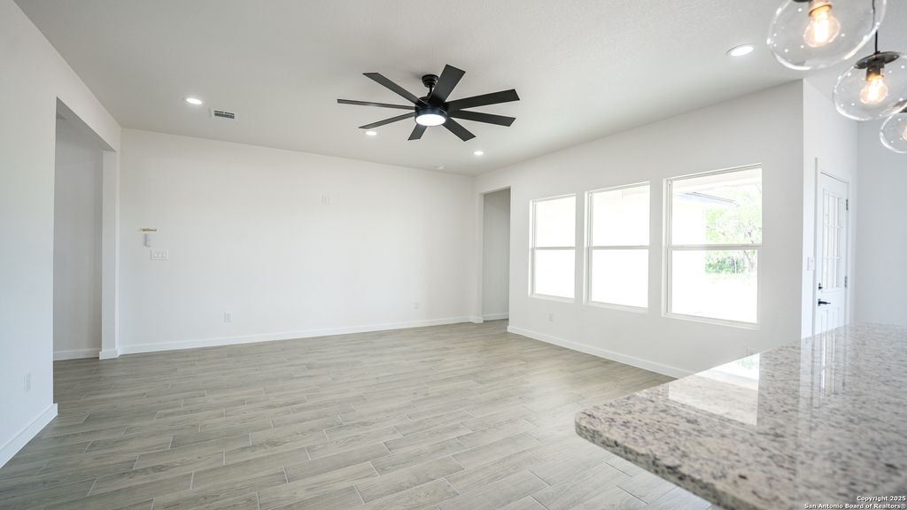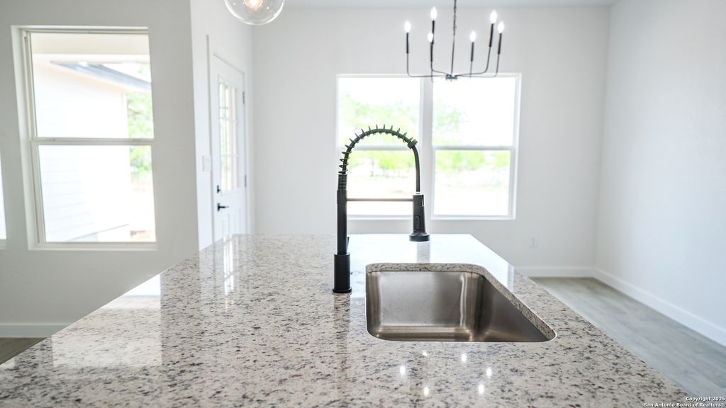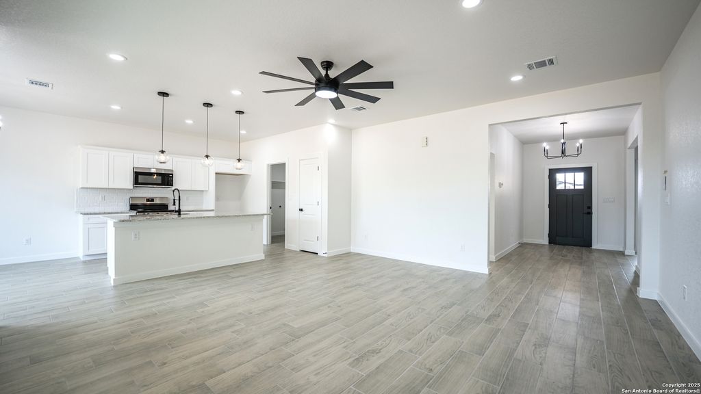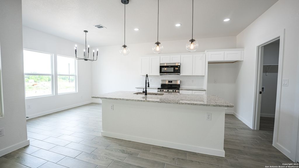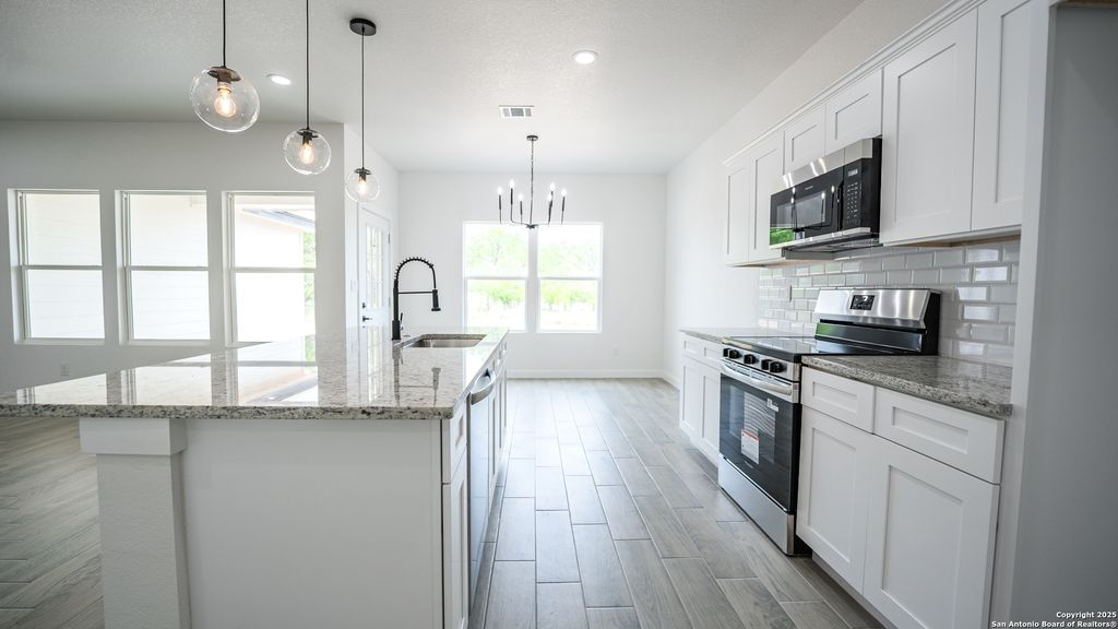 Offering ALL CLOSING COSTS PAID!! Welcome to 16720 Llano Estacado in Atascosa, Texas-a brand new, single-story stunner where modern farmhouse meets serene country charm. Perched on a spacious half-acre lot, this 4-bedroom, 2-bath home makes a bold first impression with its white and gray stone exterior, black trim accents, and matching raised garden beds. Accent exterior lighting sets the tone, while the oversized front covered patio with an extended slab creates a warm, inviting entrance. Step inside and feel the openness. You're greeted by a wide entryway and soaring 9-foot ceilings that lead into an airy, light-filled living space. Walls of windows on both sides-one in the dining area and one in the living room-flood the home with natural sunlight. Throughout the home, grey wood-look tile flooring adds durability. The striking kitchen is anchored by a large marble island that doubles as a breakfast bar for three. Sleek black globe pendant lights make an impressive statement above, while white cabinetry, stainless steel Frigidaire appliances, and a clean white tile backsplash tie everything together. A walk-in pantry keeps the space organized and clutter-free. Adjacent to the kitchen, the dining room brings extra flair with a bold black candlelight chandelier. The 17-by-16 living room is the heart of the home, effortlessly blending elegance and comfort. Recessed lighting and a modern black ceiling fan with remote complete the look. Tucked in its own private corner, the primary suite offers a true retreat. A soft glow from recessed lights and a Galea candlelight chandelier sets the mood, while a custom barn door leads into a spa-like bath. Inside, you'll find separate vanities, his and hers closets, and a walk-in shower wrapped in bold black tile with mosaic flooring and a built-in niche. Three additional bedrooms, each generously sized, sit in their own wing of the home. All feature spacious closets and modern farmhouse chandeliers. A shared soaking room offers style and function with a sleek black fixture, oversized vanity, and a tub-shower combo framed by rich black tile. Out back, a large covered patio with recessed lighting offers the perfect spot to relax, entertain, or dream up future backyard plans. With no HOA, 16720 Llano Estacado blends thoughtful design, modern finishes, and country tranquility-all in one move-in-ready package.