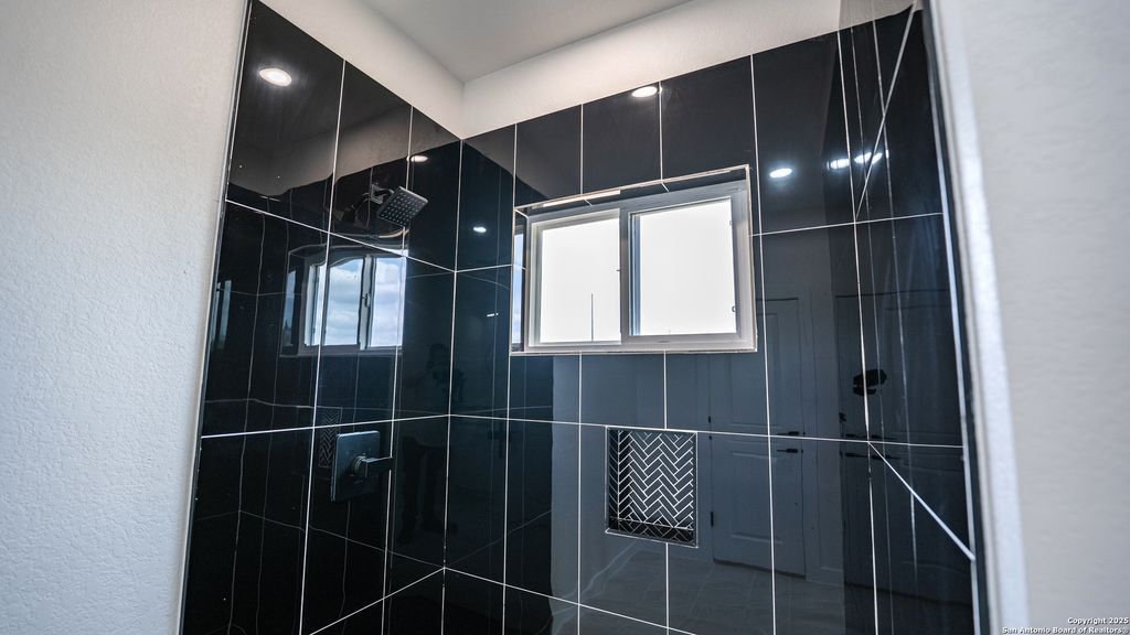 Tucked in its own private corner, the primary suite offers a true retreat. A soft glow from recessed lights and a Galea candlelight chandelier sets the mood, while a custom barn door leads into a spa-like bath. Inside, you’ll find separate vanities, his and hers closets, and a walk-in shower wrapped in bold black tile with mosaic flooring and a built-in niche.