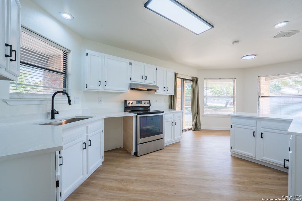 The kitchen is a true highlight, offering plenty of space for the chef of the family. Enjoy new white quartz countertops, a large breakfast bar, abundant cabinetry, stainless steel appliances, an undermount sink, and sleek recessed lighting.