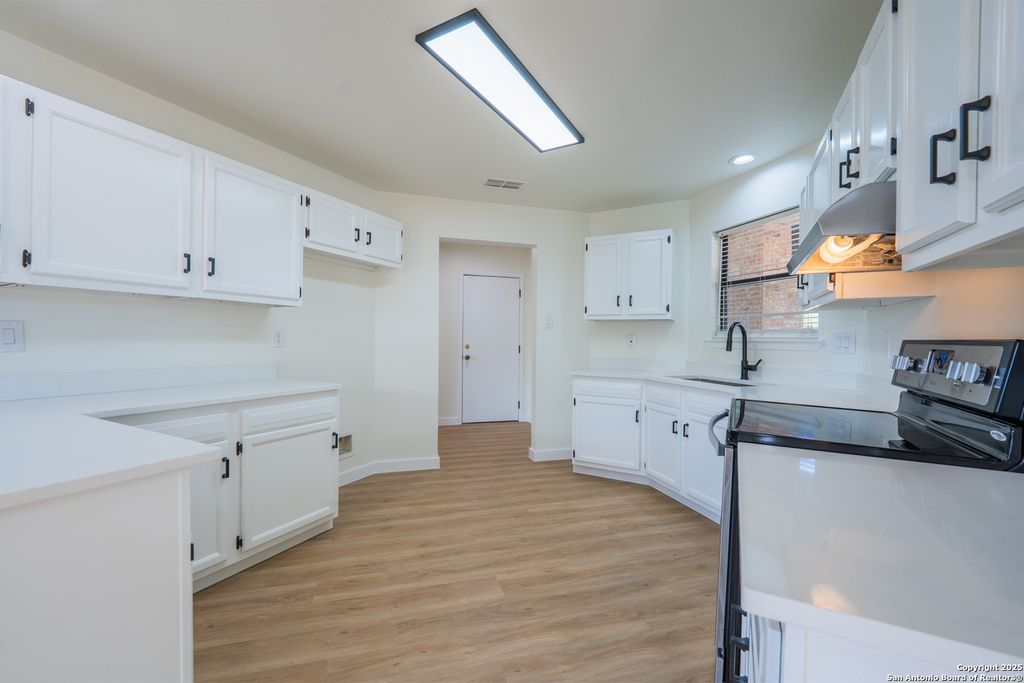 Located just minutes from the Gruene Historic District, the Guadalupe River, and New Braunfels' top shopping and dining destinations. Beautifully updated inside and out with fresh paint, this home sits on a generous corner lot in the well established neighborhood of Rhine Terrace with amazing crib appeal & mature trees. As you entering the home, notice the perfectly designed open floorplan that was built for entertaining. New vinyl plank floors have been installed throughout. Every light fixture, outlet, doorknob and light switch have been updated to match as well. The kitchen offers great space for the chef in your family. New gorgeous white quartz countertops with a huge breakfast bar, numerous cabinets, Stainless Steel Appliances, undermont stainless steel sink, & recessed lighting. The living and dinning room combo offers ideal space for your furniture and family gatherings, including high ceilings & two large windows for vibrant natural daylight. The primary bedroom offers plenty of space, with a generous walk-in closet, & beautiful on-suite. Featuring a dual vanity, custom mirror, matte black fixtures, and stunning custom walk-in shower. The additional bedrooms offer comfortable living quarters, ceiling fans, wide closets, & a well appointed updated bathroom to share. The outside living of the homes is complete with a large patio, great shade from the mature trees and storage shed. Additionally, this property provides access to highly rated Comal ISD schools and equipped with a year old roof and brand new central AC system. Come make this home yours today!