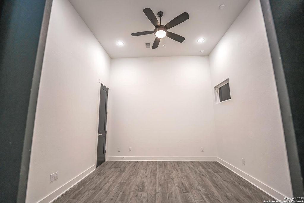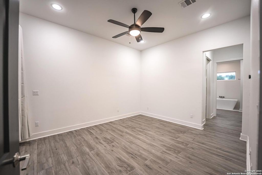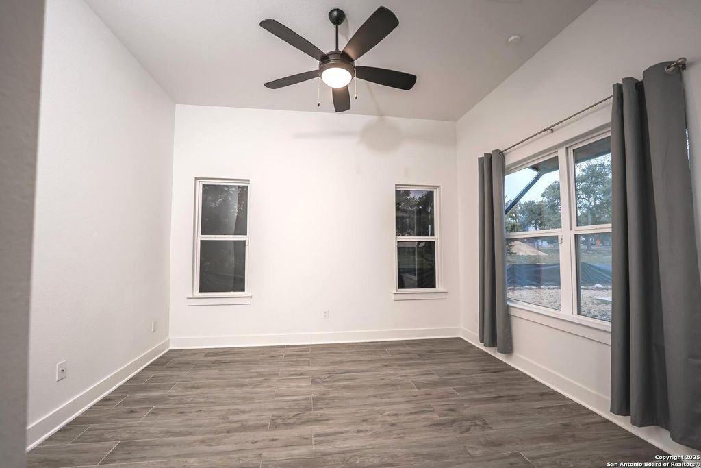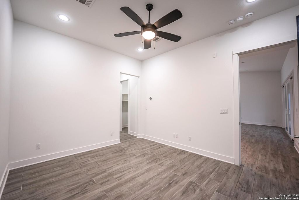 The additional bedrooms offer comfortable, modern living. One bedroom is bathed in natural light, featuring multiple windows and a walk-in closet. The other two bedrooms include black ceiling fans and spacious closets, ensuring stylish and functional spaces for any need.