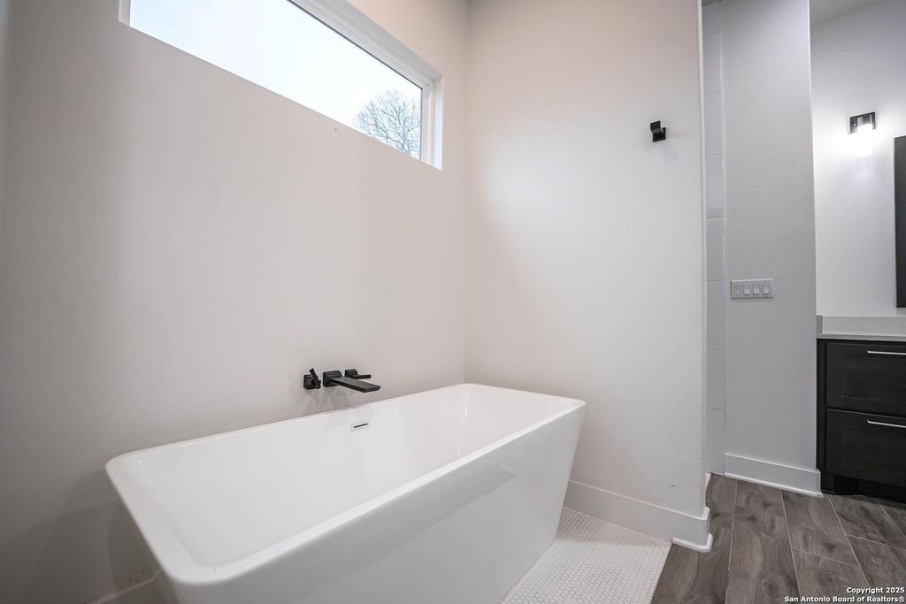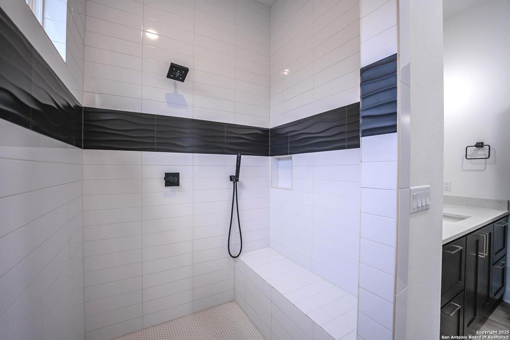 The master soaking room is pure indulgence, boasting dual vanities with quartz countertops, sleek black fixtures, and a deep soaking tub for ultimate relaxation. The walk-in shower, wrapped in floor-to-ceiling subway tile and bold black wave tile, adds a striking contrast.