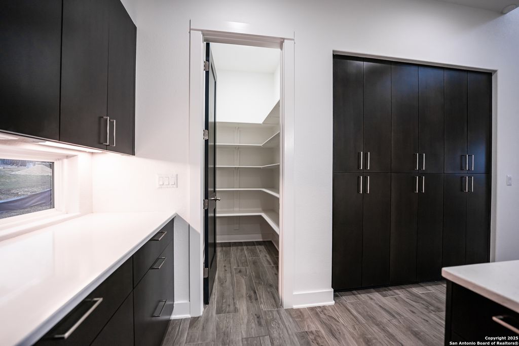 The gourmet kitchen is a chef’s dream—featuring a massive island, white quartz countertops, and custom cabinetry. High-end stainless steel appliances, including dual ovens and a flush refrigerator, blend seamlessly into the sleek, modern design. Recessed lighting and black pendant lights add a bold, contemporary touch.