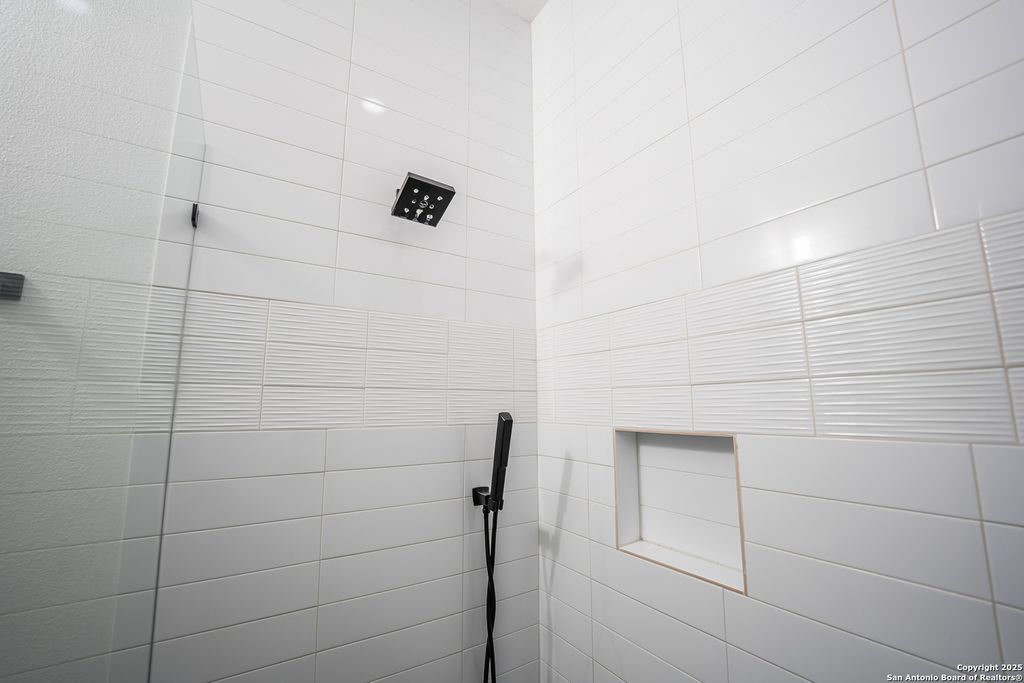 The shared bathroom continues the home’s sophisticated aesthetic with a subway-tiled stand-up shower, black hexagon mosaic flooring, and a sleek single vanity.