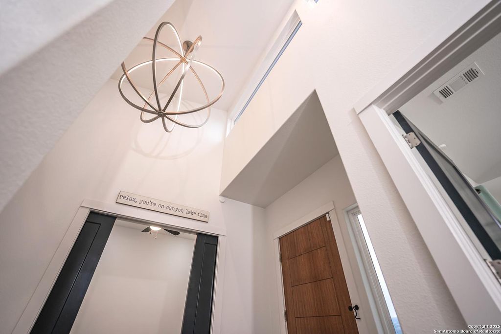 A modern masterpiece nestled in the heart of Canyon Lake, Texas. This stunning three-bedroom, two-bath home, complete with a dedicated study, offers 2,350 square feet of impeccable design on just over half an acre. Step inside and experience sophisticated living at its finest. An open-concept layout invites you into the spacious living and dining areas, where a wall of windows fills the space with natural light. The dining room's modern light fixture sets the perfect ambiance for intimate gatherings.