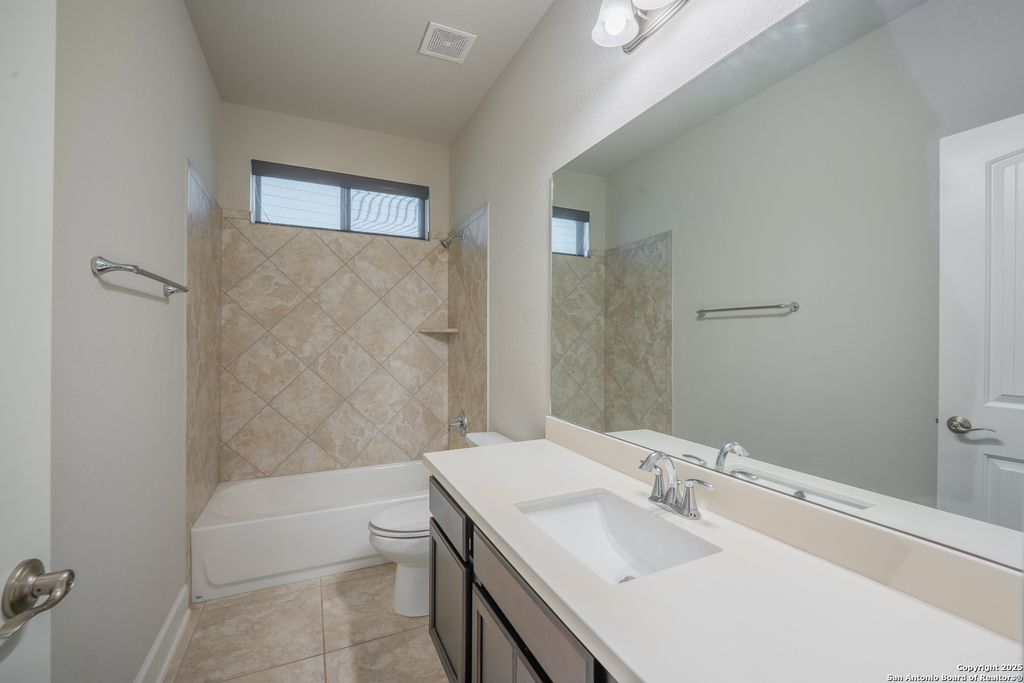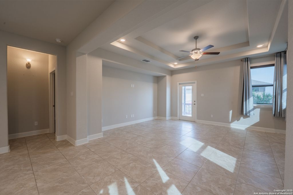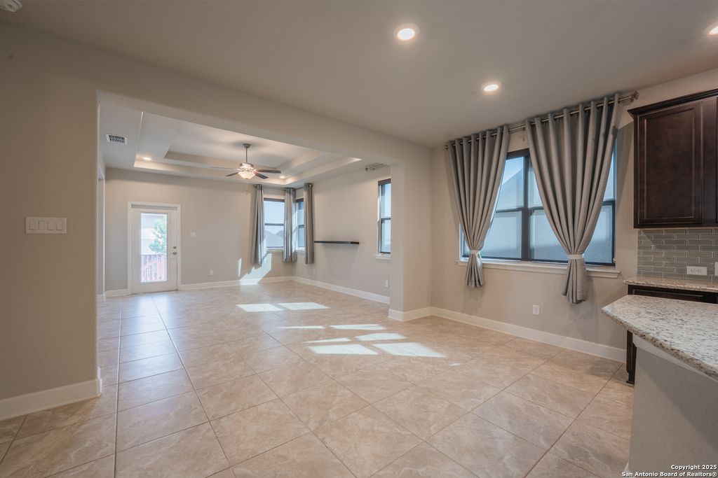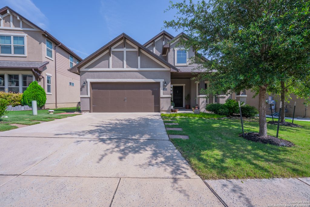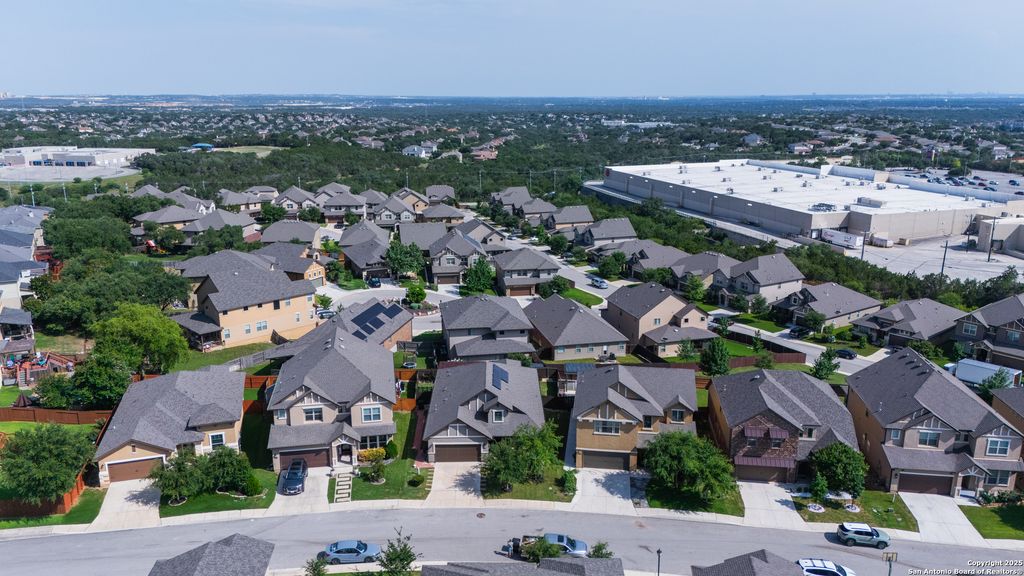 Welcome to 23126 Lexington Park, a beautifully maintained single-story home located in the gated community of The Cliffs at Cibolo – one of North San Antonio’s most sought-after neighborhoods. This energy-efficient 3-bedroom, 2-bath home with a versatile flex space offers 1,964 sq ft of thoughtfully designed living space. Outfitted with solar panels, this home delivers lower utility costs and a more sustainable lifestyle without sacrificing comfort or style. Built on the popular Lexington floor plan, the open-concept layout seamlessly connects the kitchen, dining, and living areas, creating a space that is both functional and inviting. High tray ceilings in the living room and primary suite add architectural dimension and elegance. The kitchen features a large center island, granite countertops, stainless steel appliances, gas cooktop, and built-in microwave and oven – ideal for everyday living and entertaining. A unique feature of this home is the covered front courtyard, offering a peaceful and private sitting area perfect for morning coffee or evening relaxation. Inside, the flexible front room-open to both the foyer and kitchen-can serve as a study, secondary living space, or flex room to suit your needs. Out back, enjoy a beautifully designed outdoor space with a covered patio and premium artificial decking – stylish, durable, and low-maintenance. Situated minutes from The Village at Stone Oak, Target, Alamo Drafthouse, and top-rated dining and retail, this home also offers quick access to TPC Marriott Resort, Highway 281, Bulverde Road, and is directly across from Johnson High School. With its modern layout, upgraded energy features, and unbeatable location, 23126 Lexington Park presents a rare opportunity to own a high-efficiency, move-in-ready home in a prime San Antonio community.