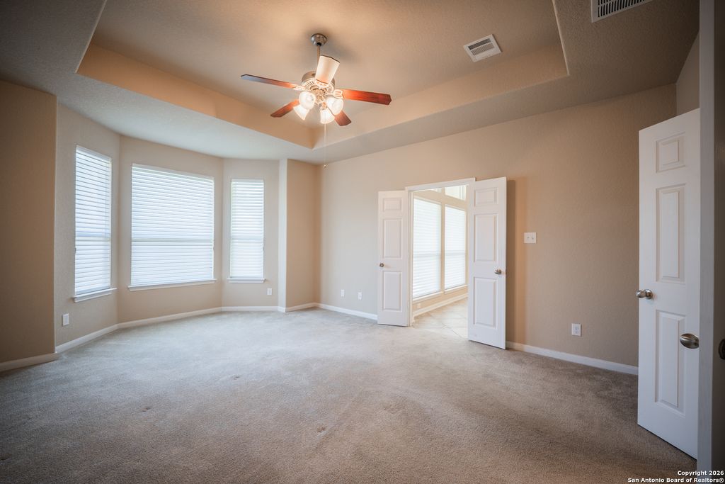 The private primary suite is a true retreat, featuring bay windows, a tray ceiling, and a comfortable sitting area. The ensuite bath offers a large walk-in shower with natural light and seating, dual counter-height vanities with extensive storage, separate his-and-hers closets, and a private water closet.