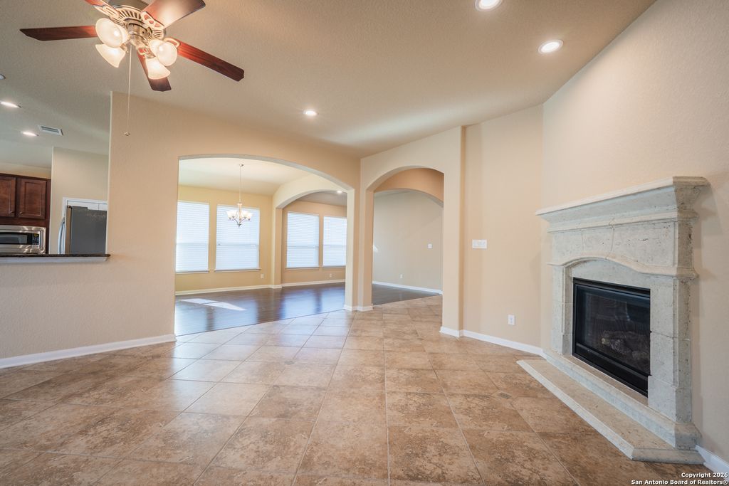 Welcome home to this beautifully maintained, single-story Ryland home, built in 2010 and ideally situated on a level lot in the sought-after, gated community of Mountain Lodge. Offering 2,431 square feet of thoughtfully designed living space, this home features four bedrooms, two and a half baths, two living areas, and two dining areas-perfect for both everyday comfort and effortless entertaining. Step inside to discover gorgeous hardwood floors, 18-by-18 ceramic tile, elegant archways, real wood shutters, and abundant natural light throughout. Neutral paint tones create a timeless backdrop that complements any style. At the heart of the home is a gourmet island kitchen with granite countertops, a custom backsplash, upgraded cabinetry with deep drawer storage, a spacious pantry, and stainless steel appliances-including a French-door refrigerator. A generous breakfast area flows seamlessly into the family room, where a cozy corner gas fireplace and entertainment alcove create an inviting gathering space. The private primary suite is a true retreat, featuring bay windows, a tray ceiling, and a comfortable sitting area. The ensuite bath offers a large walk-in shower with natural light and seating, dual counter-height vanities with extensive storage, separate his-and-hers closets, and a private water closet. Three additional bedrooms provide excellent closet space and share a beautifully appointed second full bath with a walk-in shower. The fourth bedroom also makes an ideal home office or study. Outside, enjoy your own backyard oasis with a covered patio featuring epoxy-treated flooring, landscaped garden beds, flagstone walkways, artificial turf, and stained privacy fencing-perfect for relaxing or entertaining year-round. Additional highlights include a dedicated utility room with cabinetry and full-size washer and dryer, a two-car attached garage with epoxy flooring and automatic opener, full sprinkler system, and water softener. Major upgrades include a new water heater and water softener in 2023, a brand-new HVAC system in 2025, plus added attic insulation and radiant barrier for enhanced energy efficiency. Located within acclaimed NEISD schools, offering two amenity centers, no city taxes, and a 2025 tax rate under 1.80%, this home truly is better than new.