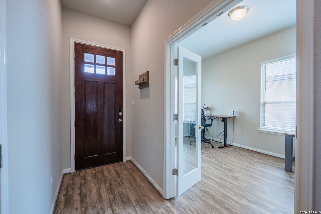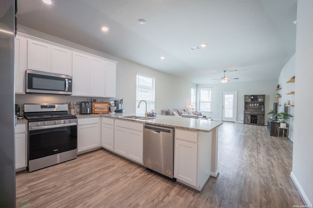 Upon entry, you are greeted with the office that could also be a formal dinning. Large indoor utility room that with plenty of room for washer, dryer, and bonus fridge. Kitchen features granite countertops, subway tile backsplash, custom cabinets, recessed lighting, SS appliances, walk in pantry, and gas cooking that opens to the spacious living area.