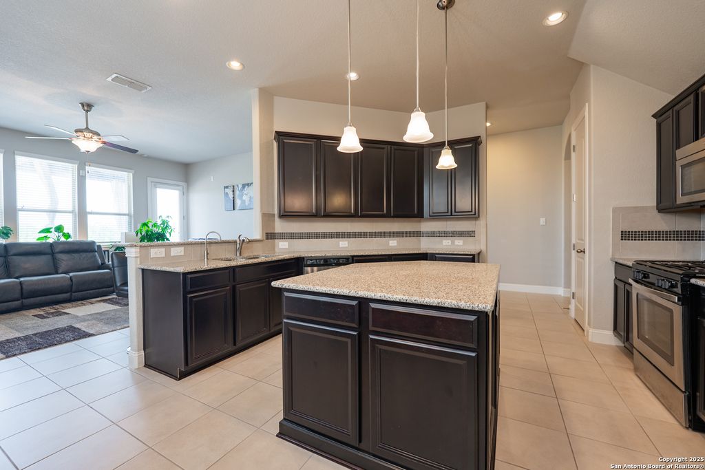 The chef’s island kitchen is a standout, featuring granite countertops, gas cooking, custom backsplash, stainless appliances, built-in microwave, two pantries, and an abundance of storage and prep space. And yes — the refrigerator is included.