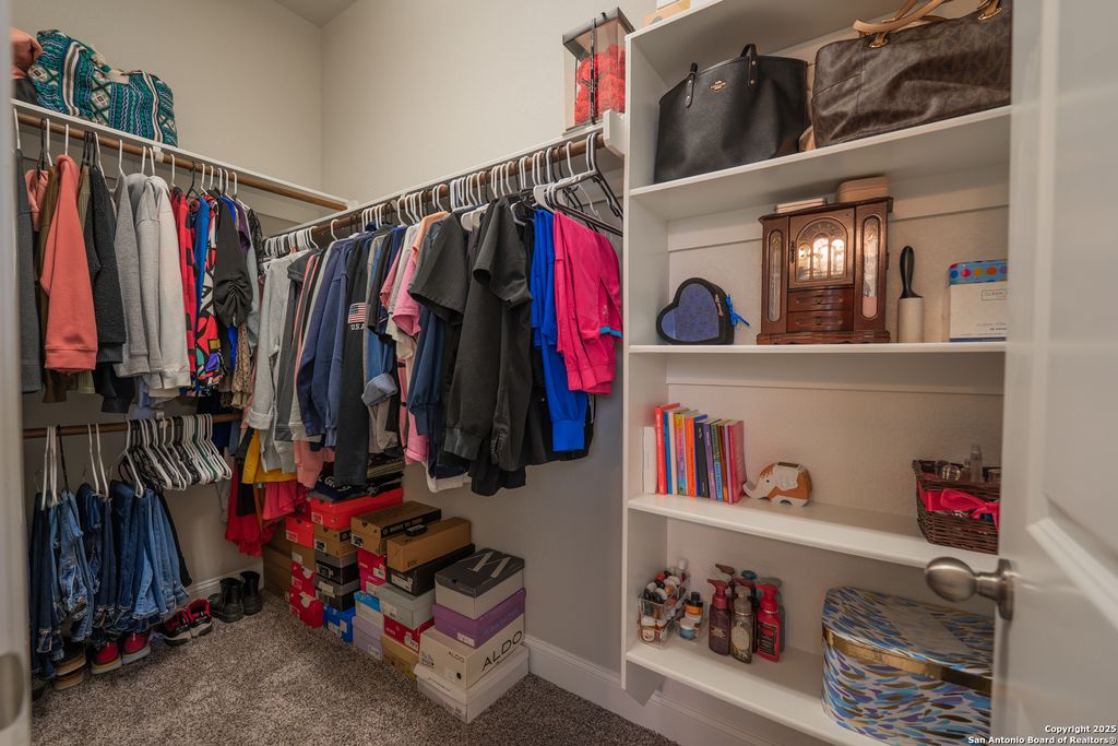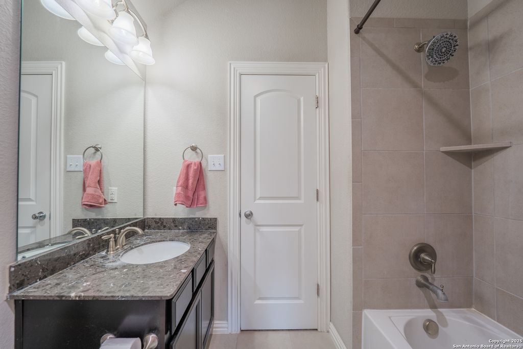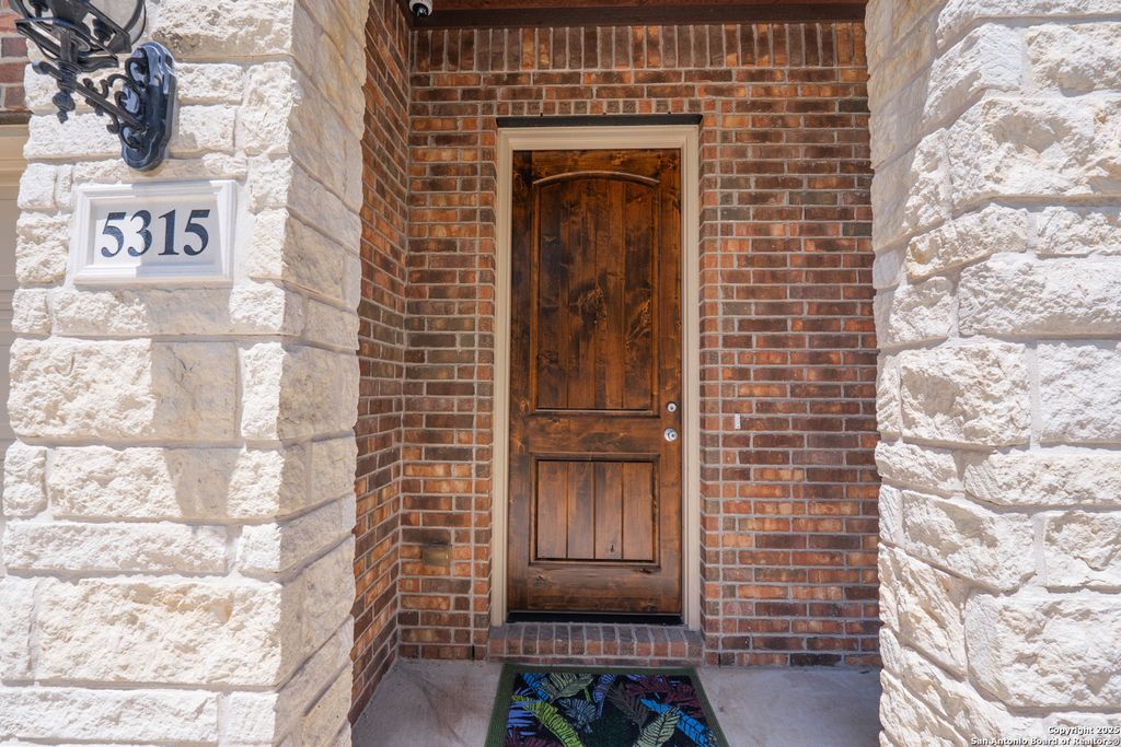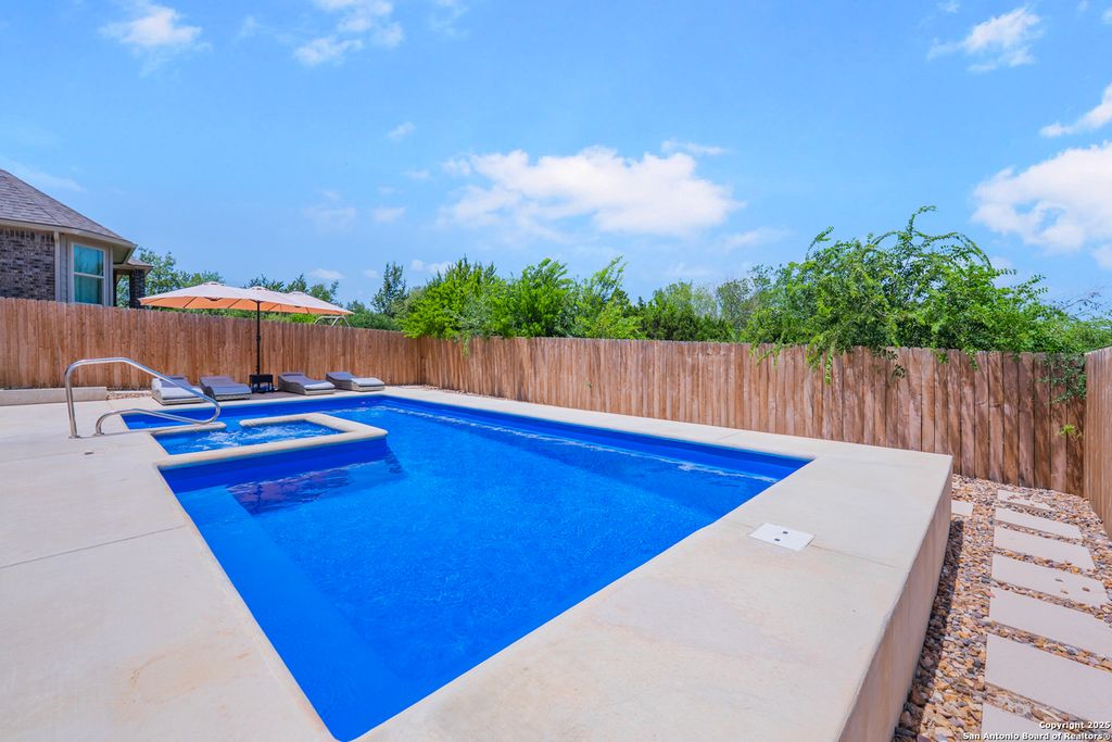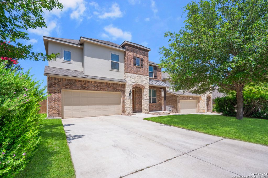 This spacious 3,651 square foot residence sits on a beautiful greenbelt lot, offering the privacy and tranquility you've been looking for. As you approach the residence, you'll notice the gorgeous landscaping, freshly refinished wood front door, tongue and groove ceiling treatment at the front covered porch, and the curb appeal afforded by the stone and brick elevation and standing seam metal accents at the roof. Inside, you'll find 5 generous bedrooms, 3.5 bathrooms, a private study with crown molding and built-ins, a game room, and a media room pre-wired with 5.1 surround sound - perfect for movie nights or entertaining. The chef's island kitchen is a standout, featuring granite countertops, gas cooking, custom backsplash, stainless appliances, built-in microwave, two pantries, and an abundance of storage and prep space. And yes - the refrigerator is included. The downstairs master retreat is your escape, with dual vanities, Moen fixtures, a mud-set walk-in shower with granite bench, garden tub, linen closet, and dual walk-in closets. Upstairs, you'll find four more oversized bedrooms, each with walk-in closets. Two of these rooms enjoy direct access to a full bath, making them ideal for guests or multigenerational living. Unwind in the large game room, or watch the game in your private media room. Step outside to the fully privacy fenced backyard, and be wowed by your own paradise - a sparkling in-ground heated saltwater pool and adjoining spa, perfect for year-round relaxation. Grill on the patio while taking in the sunset views from the covered patio with tongue and groove ceiling. This home is built for comfort and peace of mind, with a heavy composition shingle roof replaced in 2023, and one of two HVAC systems fully replaced in 2022. Additional upgrades include a front sprinkler system, Kinetico water softener with reverse osmosis, Nest thermostats, and an automatic garage door opener. Beyond the home, the community offers an amenity center with playgrounds, basketball and tennis courts, and is just minutes from premier shopping, dining, and major highways - all within the boundaries of highly rated Northside ISD schools.