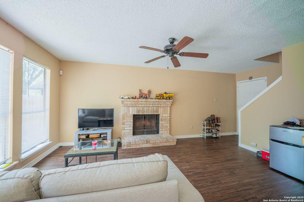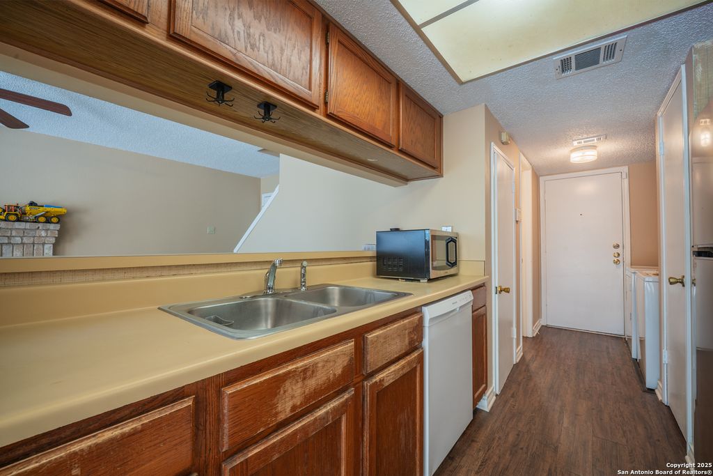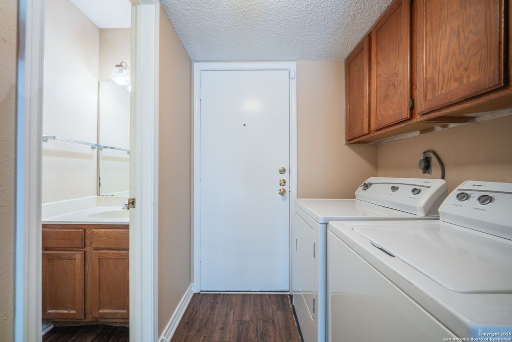 Welcome to 9916 Ardash Lane. Located in the established Northwest Crossing community, this two-bedroom, one-and-a-half-bath duplex blends comfort, convenience, and thoughtful design. The spacious living room sets a welcoming tone, with rich, dark wood laminate flooring and natural light creating a warm, inviting atmosphere. Flowing seamlessly from the living space, the dining area features large windows that overlook the fully fenced backyard-ideal for enjoying a bit of privacy or fresh air. The galley-style kitchen includes a refrigerator and offers a clean, efficient layout. Just beyond, the laundry room leads directly to a one-car garage, adding everyday ease. Upstairs, you’ll find two generously sized bedrooms and a full bath with a wide vanity and a classic tub-shower combo-perfect for both function and comfort. The second floor is fully carpeted, adding comfort underfoot, with wood laminate in the upstairs bathroom offering a sleek, practical finish. Yard maintenance is fully taken care of, so your weekends stay free and your curb appeal stays consistent. With numerous shopping and dining options just minutes away-and located within the highly rated Northside Independent School District-9916 Ardash Lane offers more than just a great layout. It offers a connected, convenient lifestyle. For more information, contact one of our REALTORS® today!
